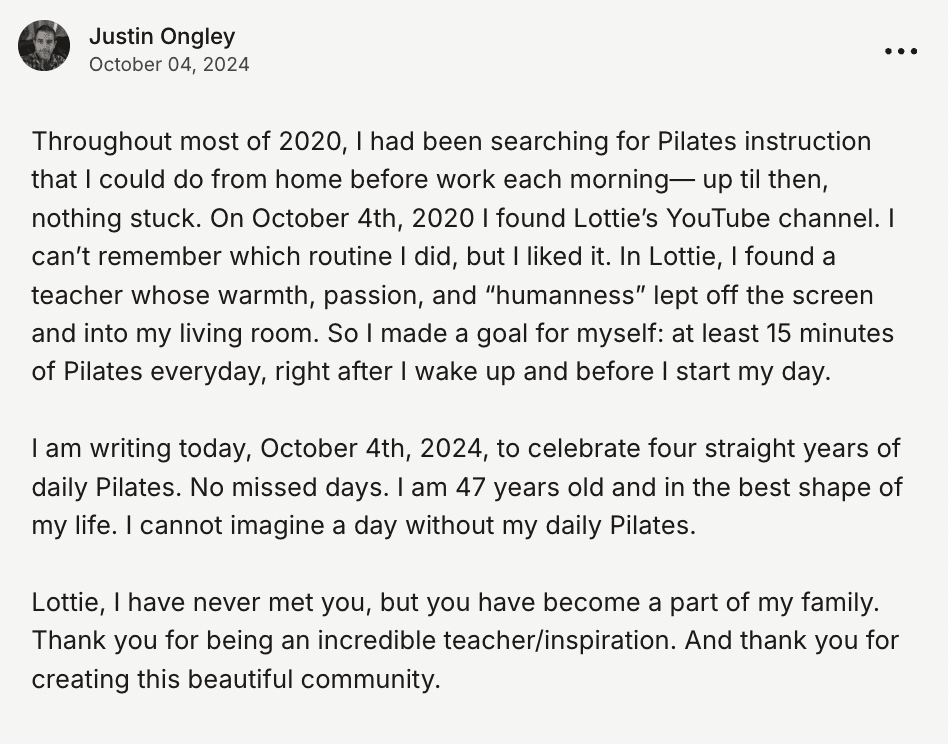 About ten years ago, I had a bad back injury that required surgery. To recover, I tried yoga and aqua therapy – while those were helpful, I just didn’t connect with the movements. Then I took a few Pilates classes at a local gym. I loved it, but I realized that I don’t like exercising with other people in a crowded room. In the fall of 2020, I stumbled across your YouTube channel where I found this class. I think I did it every morning for a month. By the time the first 24 Days of Pilates rolled around, I was hooked.